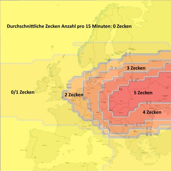 Anzahl der Zecken im Unterholz/Laubstreu in 15 Minuten in Wald- und Feldgebieten. Berechnet nach einzelnen Messungen anhand der Wetterdaten der nächsten 7 Tage.