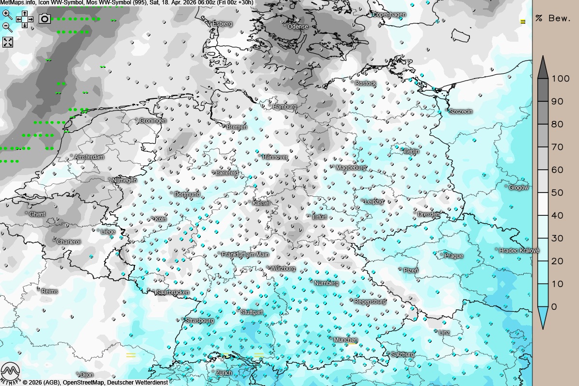Am Samstag scheint die Sonne über dem Süden und Osten von einem wolkenlosen Himmel oder es ziehen lockere Wolkenfelder durch. Von Nordwesten verdichten sich die Wolken im Nachmittagsverlauf, zum Abend hin setzt im Norden und Westen Regen ein.