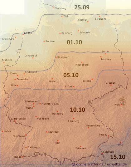 Unsere Prognoserechnung steht zugegebenermaßen auf etwas wackeligen Beinen, da bereits ein einzelner Sturm das Laub schon vorher von den Bäumen fegen könnte.