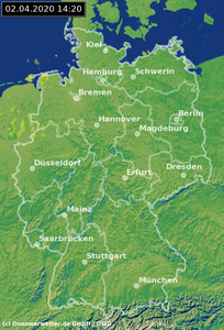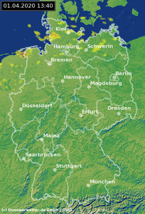 ![]() | | Radarbild 01.04.2020 Nur im Norden stellenweise nass von oben |