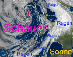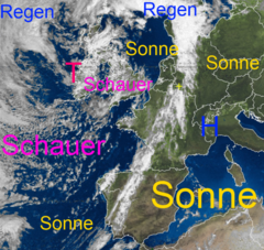 Viel Sonnenschein über Nord- und Südeuropa, dazwischen Regen- und Schauerwolken