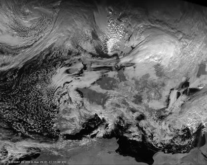 Das heutige Satellitenfoto zeigt vielfach Quellbewölkung im südlichen Europa, hier kommt es verbreitet zu Schauern, gebietsweise auch zu Gewittern. Freundlich und meist trocken ist es von Mittel- bis nach Osteuropa. Weiter im Norden des Kontinents herrscht dagegen unter Tiefdruckeinfluss meist starke Bewölkung mit möglichen Schneefällen vor.