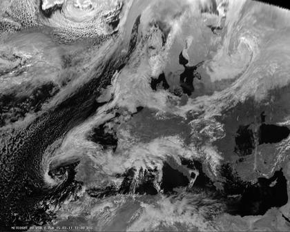 Auf dem heutigen Satellitenfoto zeigt sich ein Tief mit seinen Ausläufern über der Iberischen Halbinsel. Dort und in Teilen des westlichen Mittelmeerraums entwickeln sich bei verbreitet dichten Wolken häufig Schauer.