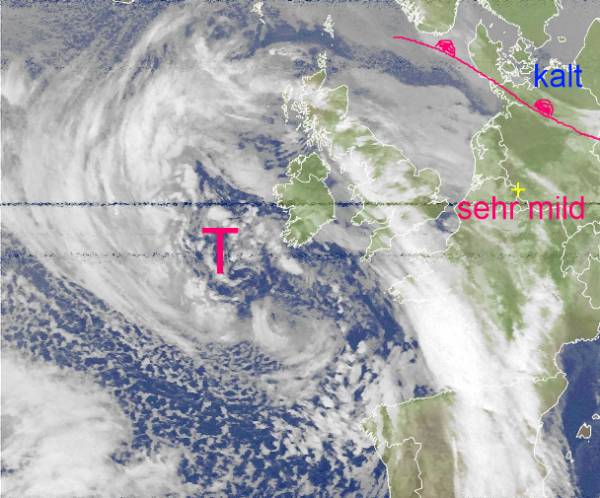 Über dem Atlantik und den Britischen Inseln hat sich ein ausgeprägter Wolkenwirbel gebildet. Er gehört zu einem kräftigen Tief südwestlich von Irland.