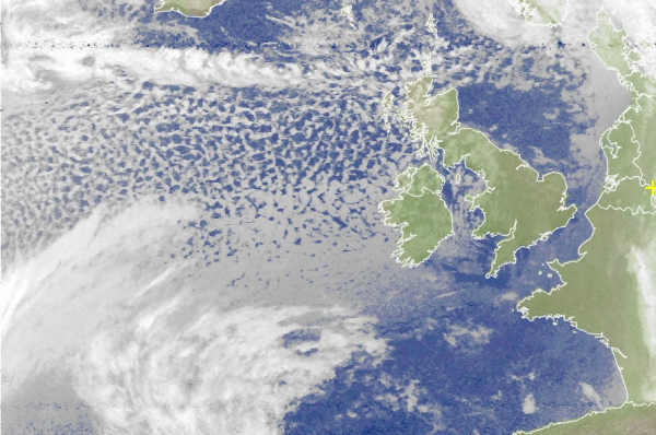 Über dem Atlantik erkennt man bereits die wabenförmige Schauerbewölkung des Sturmtiefs westlich von Norwegen, welche die heranströmende Polarluft kennzeichnet.
