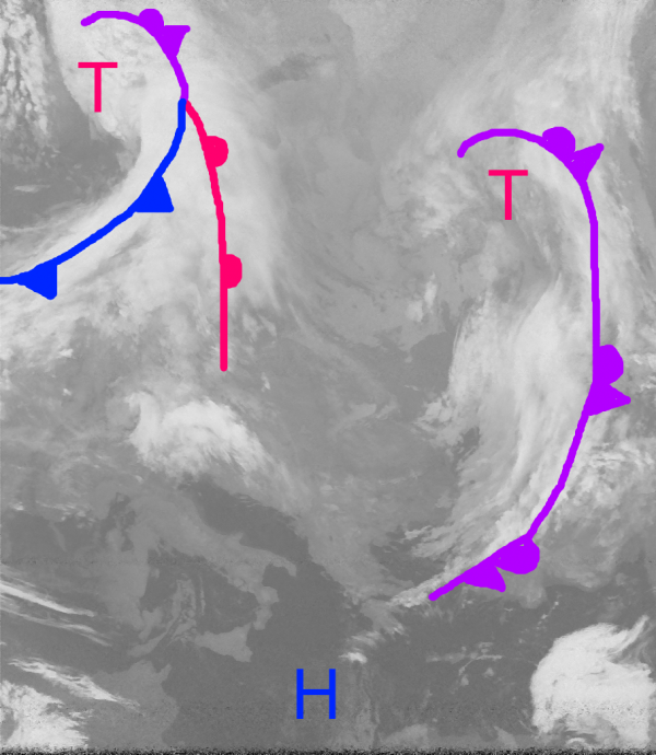 Das Satellitenfoto von heute Morgen zeigt das Vordringen der Schlechtwettergebiete bis weit in den Kontinent herein. Die milde Luft vom Atlantik hat den Winter weit nach Russland vertrieben.