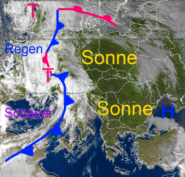Das Satellitenfoto von heute zeigt uns die Fronten des Tiefs über den Westalpen. Sie haben bereits den Südwesten Deutschlands mit Regen, Schauern, örtlichen Gewittern und teilweise auch schweren Sturmböen erreicht und leiten eine deutliche Abkühlung ein.