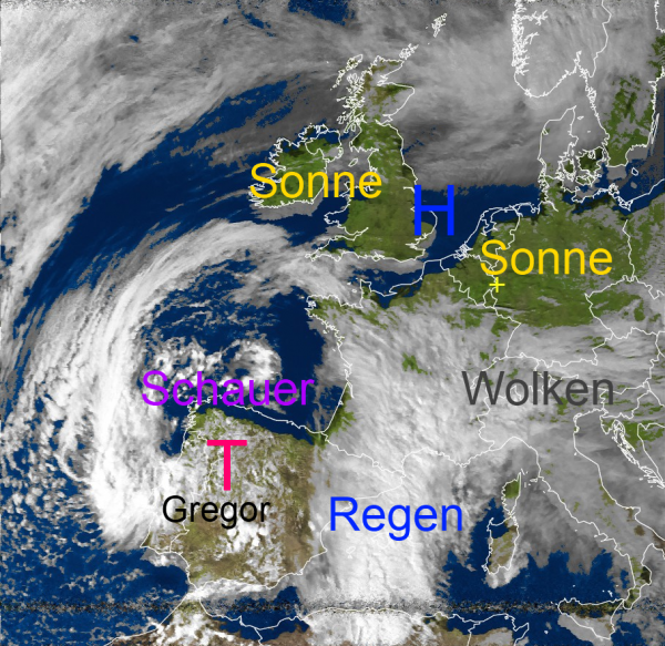 Auf dem heutigen Satellitenbild erkennt man das Tief Gregor über Spanien, welches von Nordafrika, über die Balearen bis nach Frankreich für unbeständiges und kühles Regenwetter sorgt. Bis morgen sind örtlich bis zu 100 Liter Niederschlag / m² möglich.