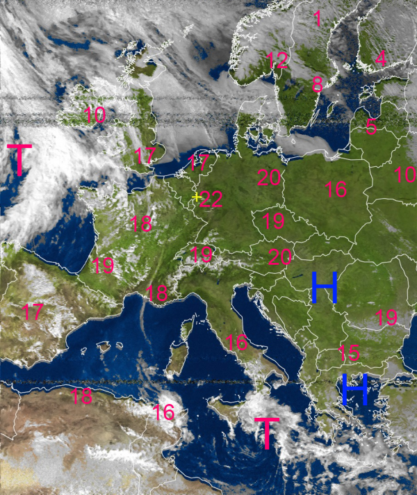 Auf dem Satellitenbild von heute erkennt man ein wolkenfreies Mittel- und Osteuropa. Ursache dafür ist das Schönwetterhoch bei Ungarn.