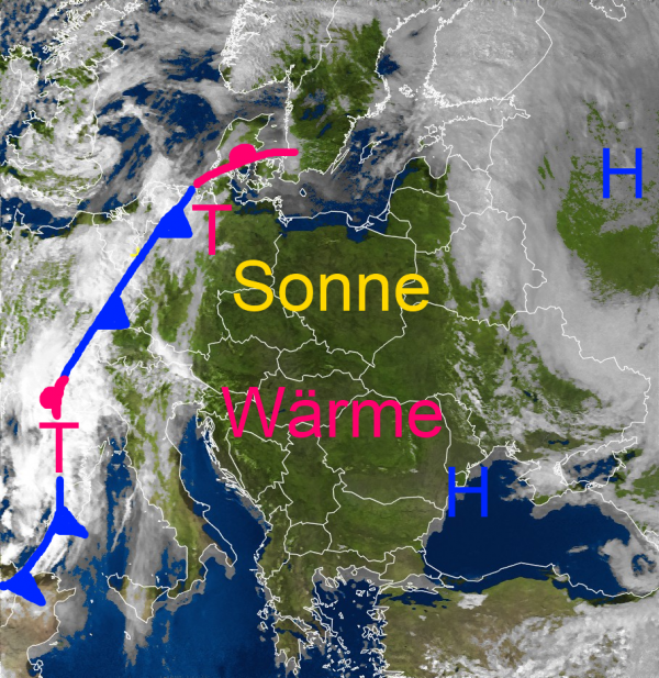 Auf dem Satellitenbild erkennt man ein wolkenfreies Osteuropa. Hier scheint verbreitet die Sonne bei warmen frühlingshaften Temperaturen. Auch über Ostdeutschland und Bayern ist es noch freundlich mit reichlich Sonnenschein und Temperaturen von verbreitet über 20 Grad. Doch im Westen sind bereits schon kompakte Wolken der Kaltfront aufgezogen. Regen fällt jedoch momentan nur vereinzelt etwas. Die Front zieht jedoch allmählich über Deutschland hinweg und kann im Tagesverlauf mancherorts Schauer und Gewitter auslösen. Dahinter gehen die Temperaturen zurück.