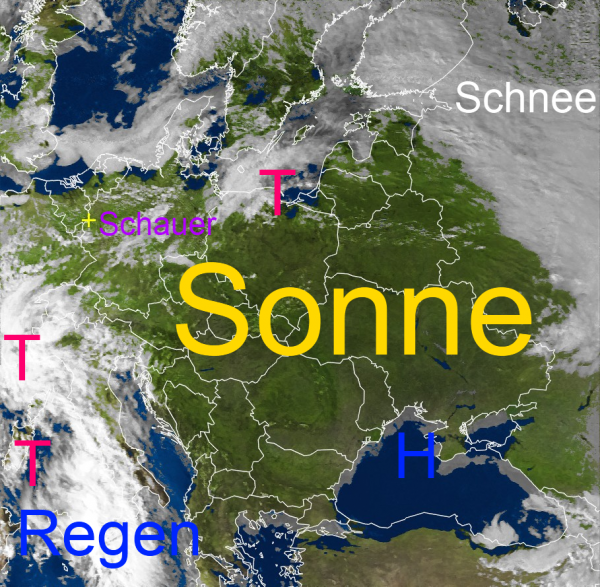 Auf dem Satellitenbild erkennt man ein wolkenfreies Osteuropa. Hier scheint verbreitet die Sonne bei warmen 20 bis 25 Grad. Nur im Bereich vom Schwarzen-Meer ist es kühler.