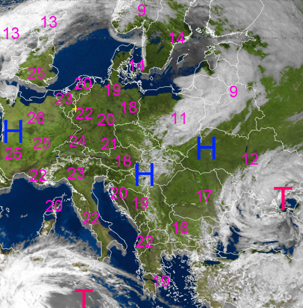 Auf dem heutigen Satellitenbild erkennt man von England, über Mitteleuropa bis zum Balkan große wolkenfreie Gebiete mit strahlendem Sonnenschein und frühlingshaften Temperaturen von über 20 Grad.