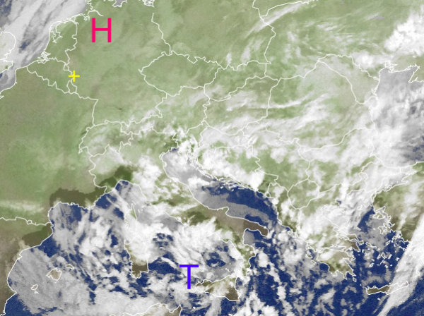 Dank eines Hochdruckgebietes hat sich die Wetterlage über Mitteleuropa beruhigt. Die im schwachen Grauton angedeuteten Wolken über Deutschland kennzeichnen tiefhängende Schichtbewölkung.