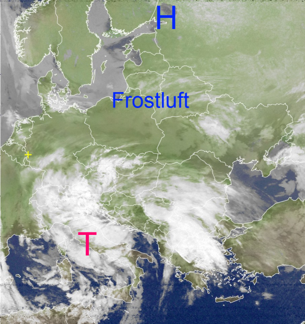 Das Hoch im Nordwesten von Russland pumpt kalte Kontinentalluft nach Mitteleuropa. Diese hat bereits schon den Nordosten von Deutschland erreicht. Über Teilen Polens und Russlands erkennt man wolkenfreie Gebiete. Dort ist die Luft schon ziemlich trocken und frostig.