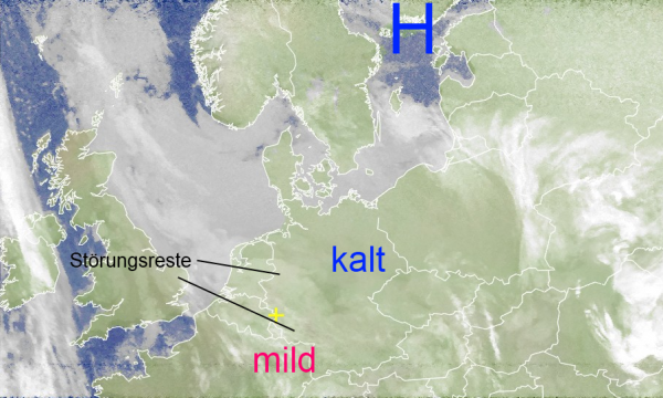 Die etwas helleren Flecken im Westen gehören zu der schwachen Atlantischen Störung, die hier für leichten Niederschlag sorgten. Im nördlichen Teil von NRWs fiel auch Schnee.