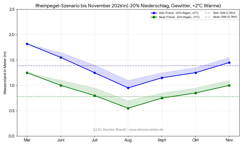 Aktuelle Prognosen und unsere Szenarien zeigen, dass der Rheinpegel an den Schlüsselstellen Kaub und Köln bereits in Kürze auf Stände fallen könnten, die den Schiffsverkehr massiv einschränken: