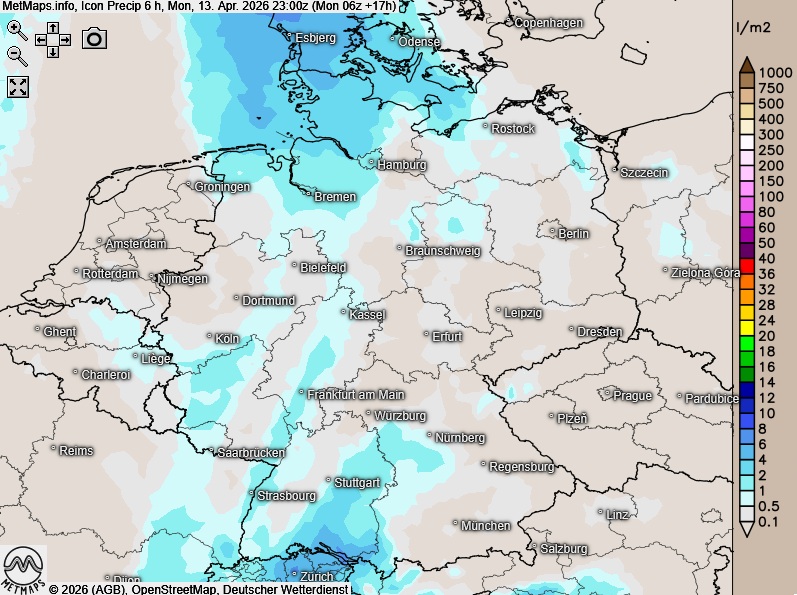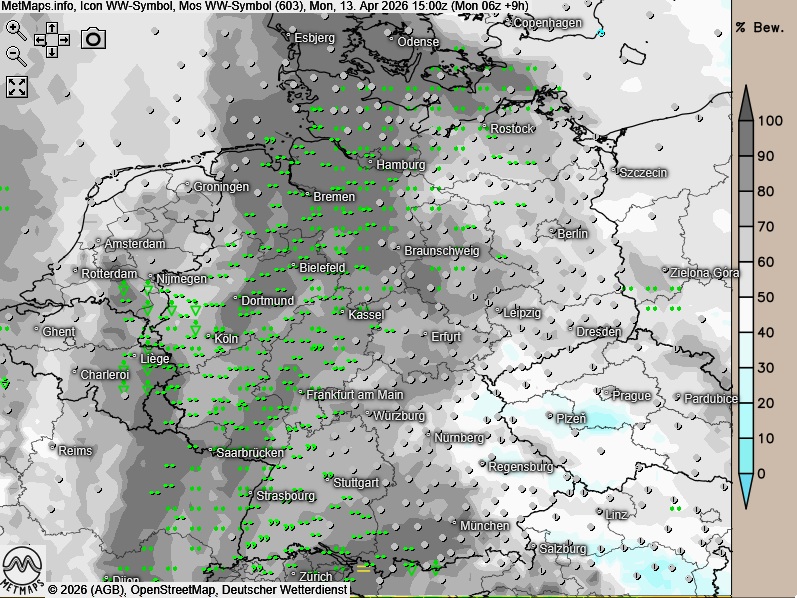 Am Montagnachmittag zeigt sich der Himmel über der Westhälfte stark bewölkt oder es ist bedeckt, dabewi fältt zeit- und gebietsweise Regen. In den übrigen Landesteilen ist es wolkig, längere Lichtblicke beschränken sich auf den Osten und Südosten Deutschlands. Auch hier muss mit einzelnen Schauern, in den Alpen und im Bayerischen Wald auch lokalen Gewittern gerechnet werden.