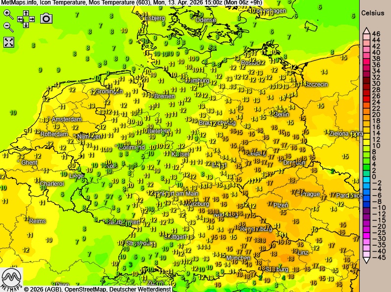 Die Wetter- und Temperaturkarte für 15:00 Uhr sowie die 6-Stunden-Regenmengen bis 23:00 Uhr nach ICON: