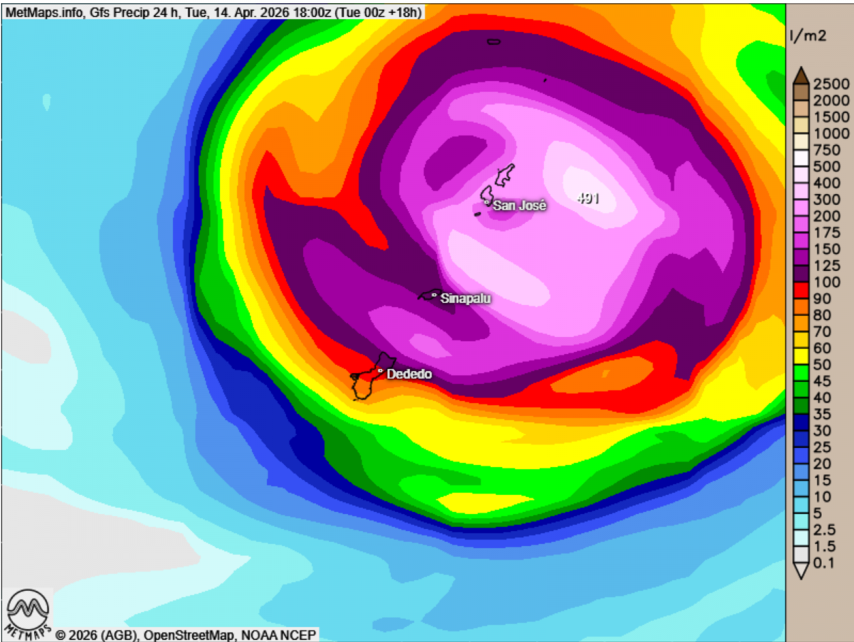Ein tropisches Sturmsystem sorgt derzeit rund um Guam für kräftigen Regen, Böen in Orkanstärke und erhöhte Überschwemmungsgefahr.
